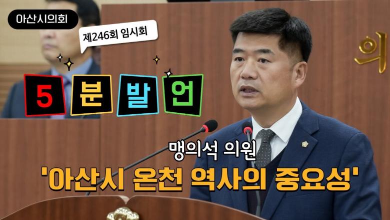 아산시의회 맹의석 의원(나선거구)이 11월 27일 제246회 아산시의회 제2차 정례회 제1차 본회의에서 아산시 온천 역사의 중요성에 대한 주제로 5분 발언을 하였다.맹의석 의원은 ...