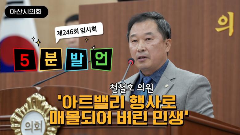 아산시의회 천철호 의원이 27일 제246회 아산시의회 정례회 제1차 본회의에서 ‘아트밸리 행사로 매몰되어 버린 민생, 우선순위의 실종’이란 주제로 5분 자유발언을 했다.천철호 의원...