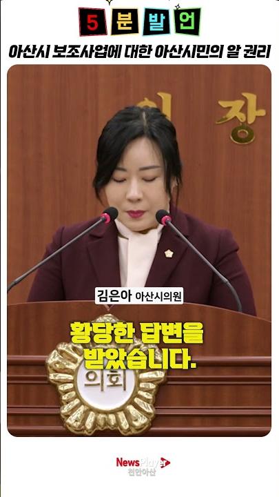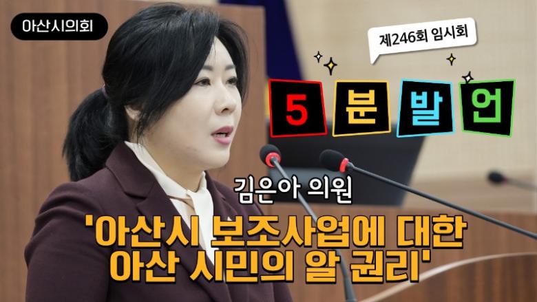 아산시의회 김은아 의원(마 선거구)이 11월 27일 제246회 아산시의회 제2차 정례회 제1차 본회의에서 ‘아산시 보조사업에 대한 아산시민의 알 권리’란 주제로 5분 발언을 했다....