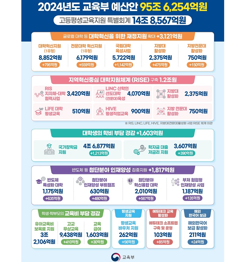 이를 통해 고등교육 재정을 확충해 글로컬대학 지원, 첨단분야 인재양성, 대학생의 학비 부담경감 등에 전년 대비 5912억원 증액해 투자하겠다는 계획이다.