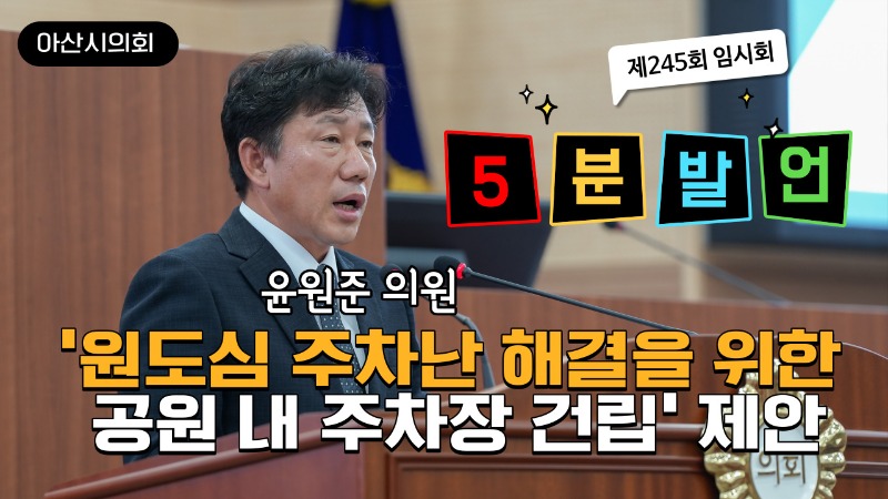 아산시의회 윤원준 의원은 10월 16일 제245회 아산시의회 임시회 제1차 본회의에서 원도심 주차난 해결을 위한 공원 내 주차장 건립에 대해 5분 발언을 하였다.