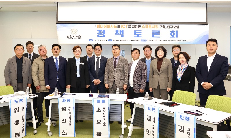 천안시의회 의원 연구모임 ‘미디어파사드와 ICT를 활용한 연구모임(대표의원 정선희)’(이하 ‘스마트시티 연구모임’)은 11월 8일 천안그린스타트업타운에서 정책토론회를 개최했다. 토론회에는 시민과 공무원 등 50여 명이 참석하여 「천안형 스마트도시」무엇을 준비하나라는 주제로 산업계·학계 전문가들과 지역특화형 스마트도시에 대한 구상과 의견을 나눴다.